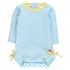 Blue Breeze Seersucker Seersucker Long Sleeve One Piece Rash Guard Swimsuit, with Signature Rear Ruffles. Perfect for sun-soaked adventures, this girls' swimsuit combines style and functionality. Featuring UPF 50+ sun protection, this one-piece offers excellent coverage against harmful UV rays. Its long sleeves and 4-way stretch fabric ensure comfortable movement, making it ideal for active little ones. The charming blue seersucker pattern and signature rear ruffles add a touch of whimsy, while the practical quarter zipper and snaps make changing a breeze. Full seat coverage maintains modesty and comfort throughout the day. Ideal for girls who love to splash and play, this swimsuit is a must-have for beach days and poolside fun.